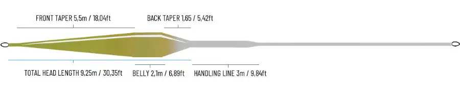 Der kurze, 9,25 m lange Kopf lässt sanfte Präsentation und schnelle Richtungswechsel zu. Das Hauptgewicht ist im hinteren Teil des Bauches, nahe an der Rute, konzentriert, um die Performance bei Unterhandwürfe zu verbessern. Diese Schnur ist unsere Nr. 1 zum Erlernen verschiedener wassergebundener Würfe (Spey). Der kürzere Kopf im Vergleich zur Elite und Distance macht das Einwerfen und die Ankerphase viel einfacher und man braucht viel weniger Platz dafür. Wenn Sie an sehr engen Stellen fischen, müssen Sie den Wurf vielleicht eher vor als neben sich ankern, diese Schnur eignet sich hervorragend für solche Situationen. Ähnlich wie die anderen Fario Schnüre hat auch die Tactical eine lange vordere Verjüngung von 5,5 m (18 ft), die einen sanften Übergang von Kraft und Geschwindigkeit bietet, um eine feine Präsentation zu erzeugen. Das Reartaper 1,65m lang und sorgt für extra Stabilität im Wurf. Die hintere Verjüngung geht in eine komfortable 3,0 m lange „Handling Line“ über, bevor die dünnere Running Line einsetzt. Die Handlingzone ist ein etwas dicker alsTeil die Running Line, was mehr Flexibilität biete und es erlaubt auch mal ein bisschen mehr Schnur außerhalb des Spitzenrings zu haben. Zudem macht dies den Übergang zwischen Kopf und Running Line deutlich langlebiger. Sie ist an beiden Enden mit einer Schlaufe versehen und hat eine Laser-ID-Markierung auf der Schlaufe am vorderen Ende.